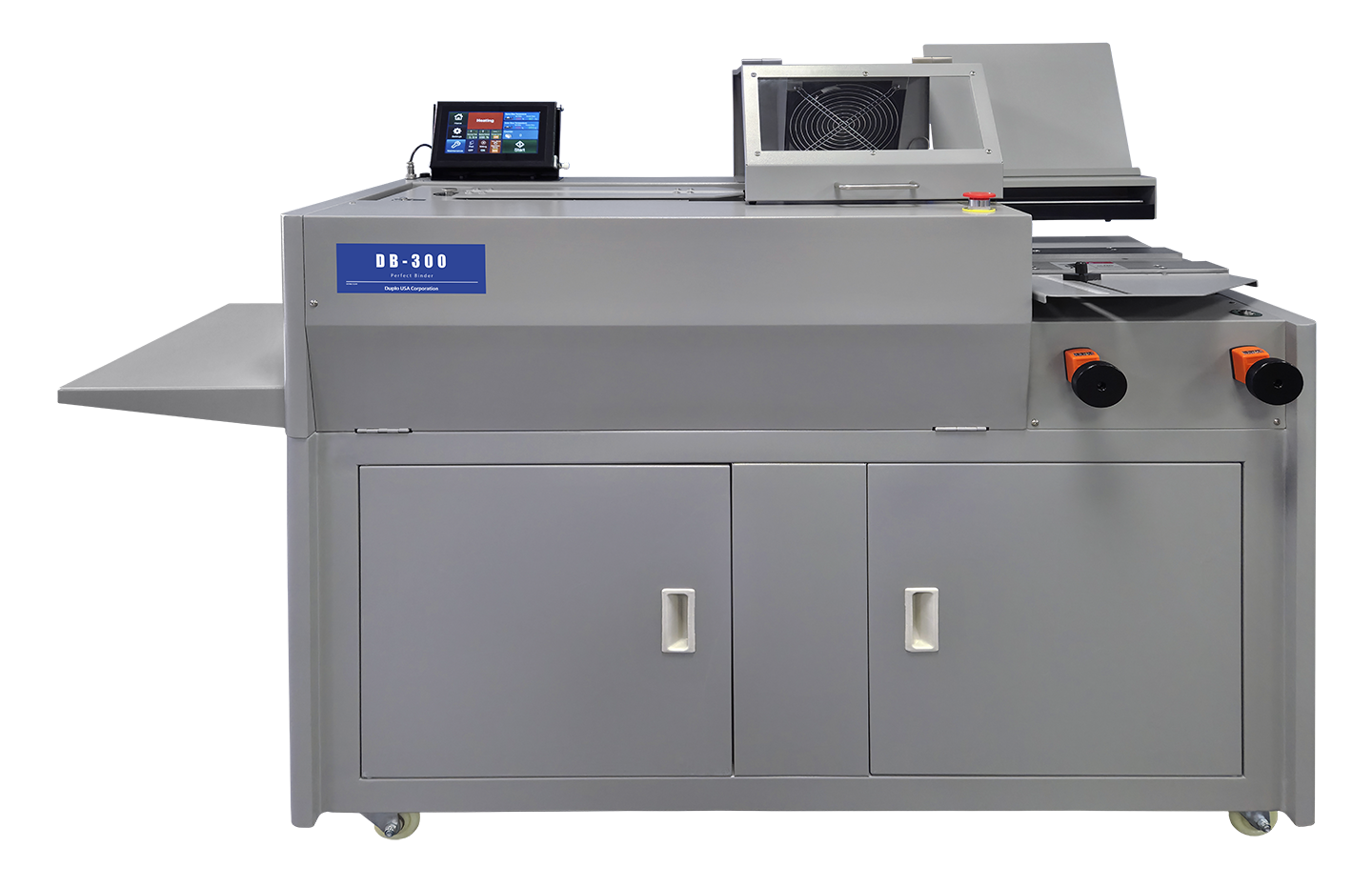 The stand-alone DB-300 produces books up to 2″ thick at up to 400 cycles per hour. The operator inserts the book block inside the single clamp and the book cover in the nipping station. Once binding is in progress, the book block is moved across the milling and notching station to roughen up the spine in preparation for the glue application. The glue tank comes equipped with two side gluing wheels to bind the edges of the book for proper opening and closing. The adjustable nipping and clamping station accommodate a variety of book thicknesses for a professional finish every time.